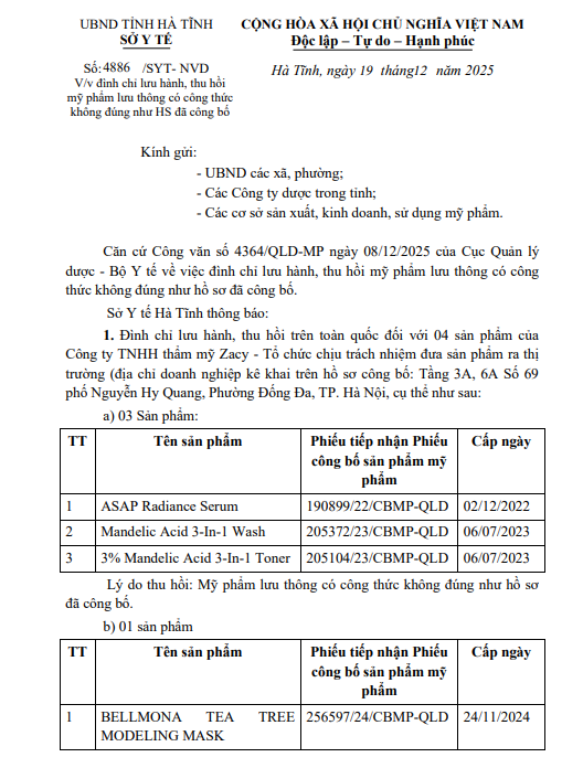 Đình chỉ lưu hành, thu hồi mỹ phẩm lưu thông có công thức không đúng như HS đã công bố.Ẩn danh19/12/2025A -A+Ẩn danh19/12/2025A -A+