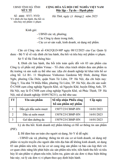 Sở Y tế tỉnh hà Tĩnh ban hành công văn số 4800/SYT-NVD ngày 15/12/2025 về việc đình chỉ lưu hành, thu hồi và tiêu hủy mỹ phẩm vi phạm - 03 SP Vimac.