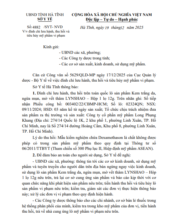 Đình chỉ lưu hành, thu hồi và tiêu hủy mỹ phẩm vi phạm - LynshaoẨn danh19/12/2025A -A+Ẩn danh19/12/2025A -A+