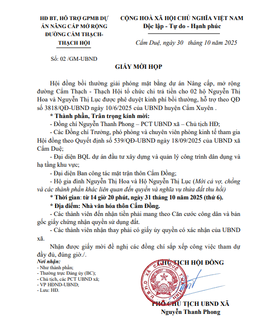 Hội đồng bồi thường giải phóng mặt bằng dự án Nâng cấp, mở rộng đường Cẩm Thạch - Thạch Hội tổ chức chi trả tiền cho 02 hộ Nguyễn Thị Hoa và Nguyễn Thị Lục được phê duyệt kinh phí bồi thường, hỗ trợ theo QĐ số 3818/QĐ-UBND ngày 10/6/2025 của UBND huyện Cẩm Xuyên