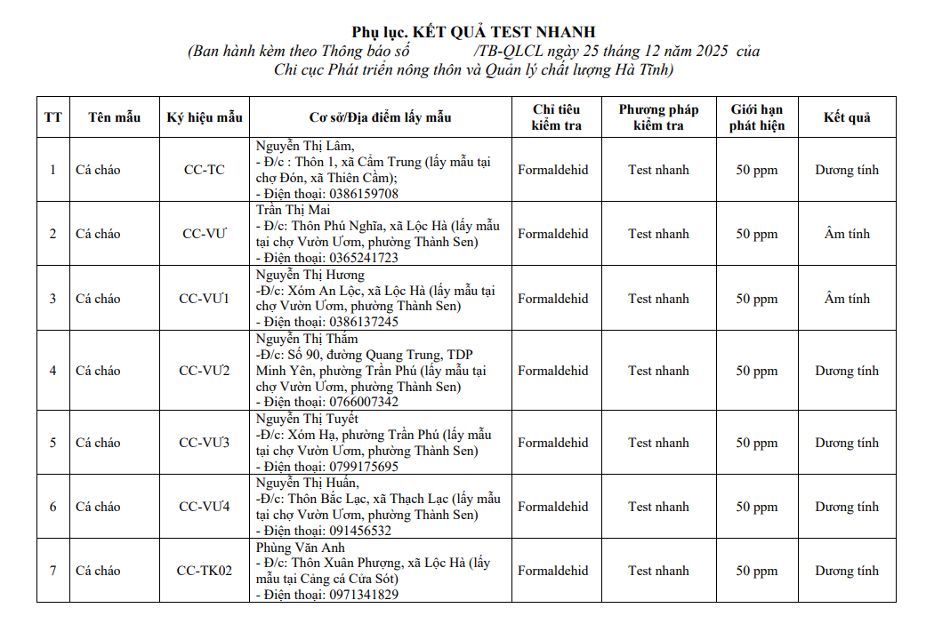 Chi cục Phát triển nông thôn và Quản lý chất lượng-Sở Nông nghiệp và Môi trường ban hành thông báo số 889/PTNTQLCL ngày 26/12/2025 về kết quả test nhanh Formol trong mẫu cá cháo.
