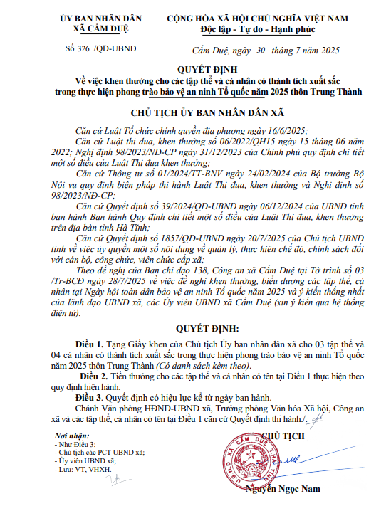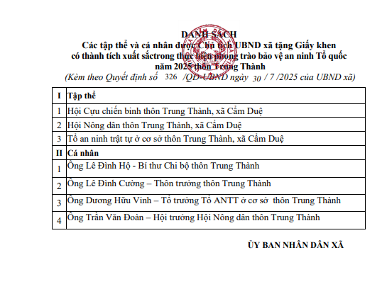 Khen thưởng thành tích xuất sắc trong thực hiện phong trào bảo vệ an ninh Tổ quốc năm 2025 thôn Trung ThànhẨn danh30/07/2025A -A+Ẩn danh30/07/2025A -A+ File đính kèmUBND_-QD-khen-thuong-toan-dan-BV-ANTQ-2025-311(30.07.2025_16h52p26)_signed.pdf