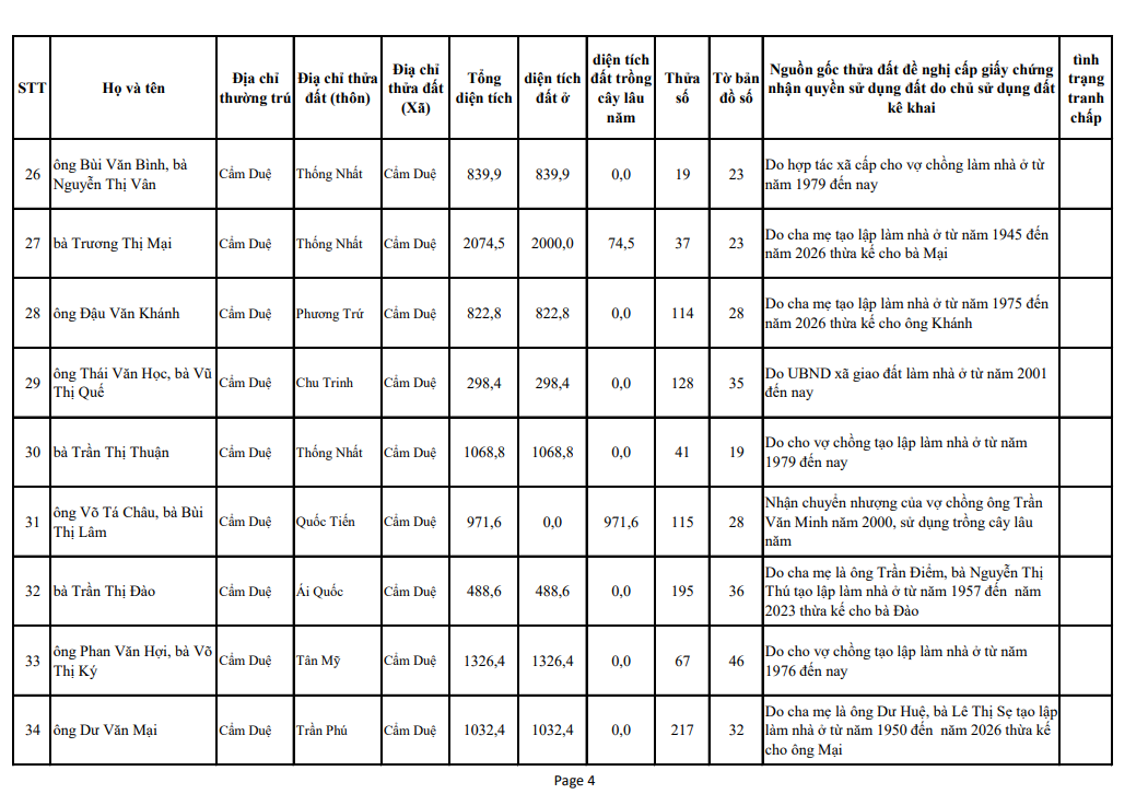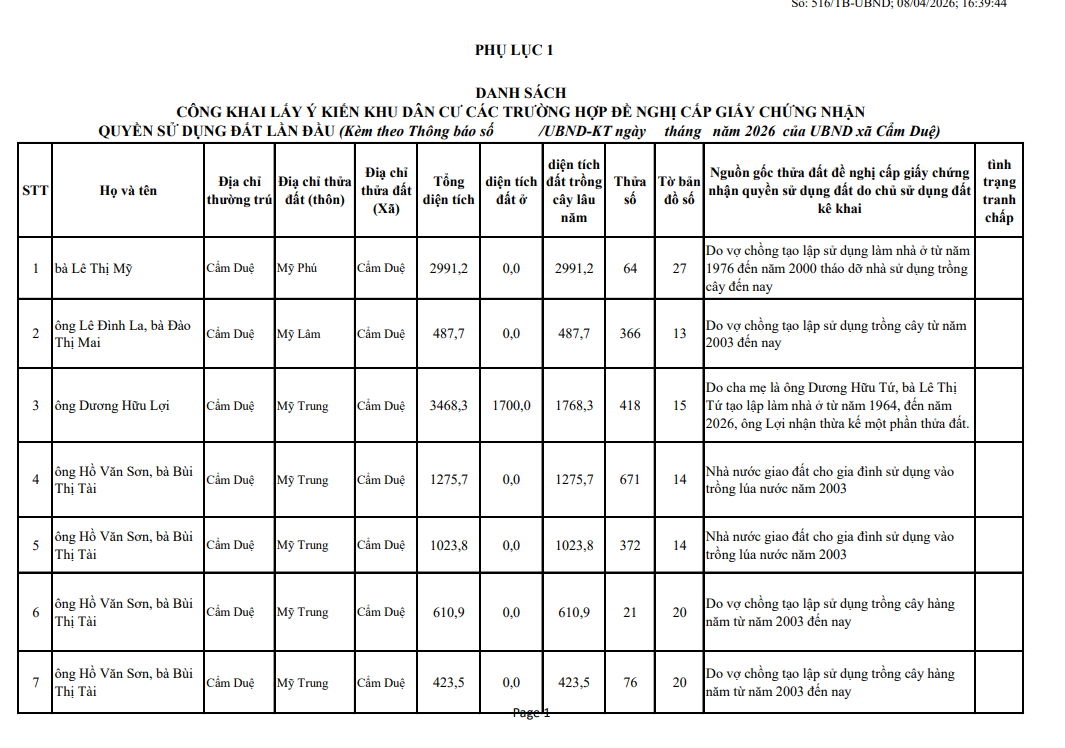 Ngày 08/04/2026 niêm yết công khai các trường hợp đề nghị cấp giấy chứng nhận quyền sử dụng đất lần đầuẨn danh08/04/2026A -A+Ẩn danh08/04/2026A -A+ File đính kèm6.4-Danh-sach-cong-khai-lan-4(08.04.2026_16h40p12)_signed.pdf6.4-Thong-bao-niem-yet-cong-khai-lan-4(08.04.2026_16h38p22)_signed.pdf