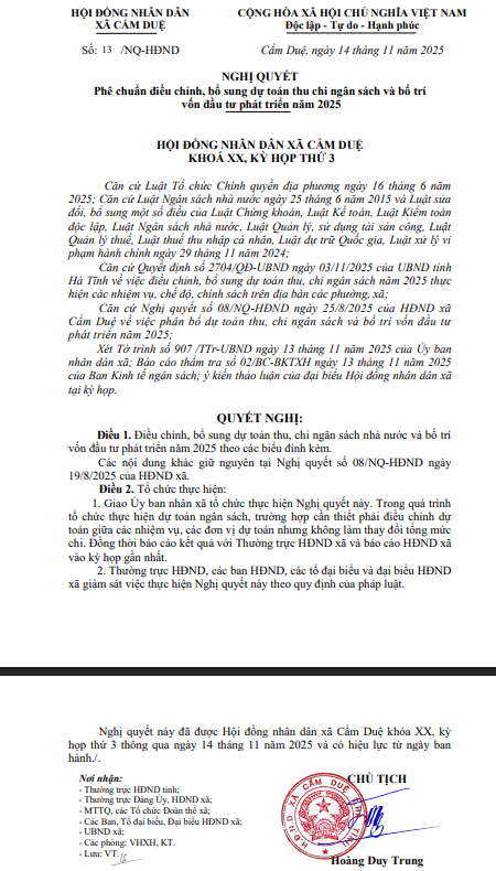 Nghị quyết phê chuẩn điều chỉnh, bổ sung dự toán thu chi ngân sách và bố trí vốn đầu tư phát triển năm 2025Ẩn danh14/11/2025A -A+Ẩn danh14/11/2025A -A+File đính kèmNQ-HDND-XA-DIEU-CHINH-PHAN-BO-DU-TOAN-THU-CHI-NGAN-SACH-NAM-2025_hieplvcamdue-17-11-2025_09h28p12(17.11.2025_11h00p49)_signed.pdfphu-luc-kem-nq-dieu-chinh-du-toan-thu-chi-ngan-sach-nam-2025.hai_xcamdue-21-11-2025_10h57p45(21.11.2025_10h58p25)_signed (1).pdf