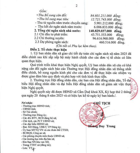 Nghị quyết về việc phân bổ dự toán thu chi ngân sách và vốn đầu tư phát triển xã Cẩm Duệ năm 2025 sau sắp xếp đơn vị hành chínhẨn danh25/08/2025A -A+Ẩn danh25/08/2025A -A+ Phụ lục có file chi tiết kèm theo File đính kèmNQ so 08 phan bo du toan thu chi ngan sach va von dau tu phat trien nam 2025(28.08.2025_21h23p42)_signed.pdf