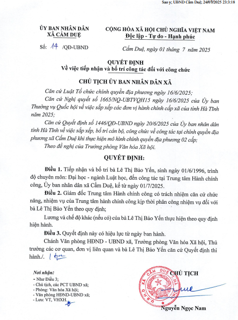 Quyết định tiếp nhận và bố trí công tác đối với bà Lê Thị Bảo YếnẨn danh01/07/2025A -A+Ẩn danh01/07/2025A -A+File đính kèmlê thị bảo yến.pdf