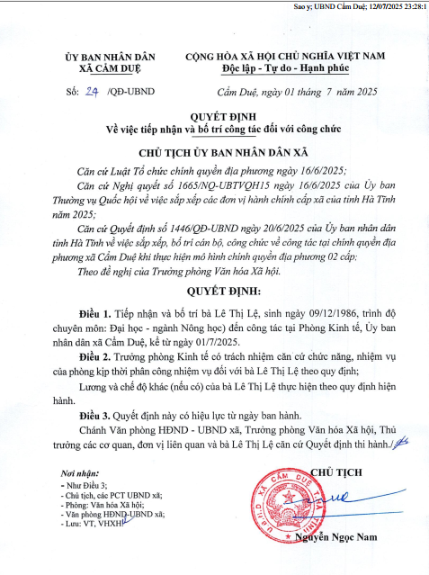 Quyết định tiếp nhận và bố trí công tác đối với bà Lê Thị LệẨn danh01/07/2025A -A+Ẩn danh01/07/2025A -A+File đính kèmlê thị lệ.pdf