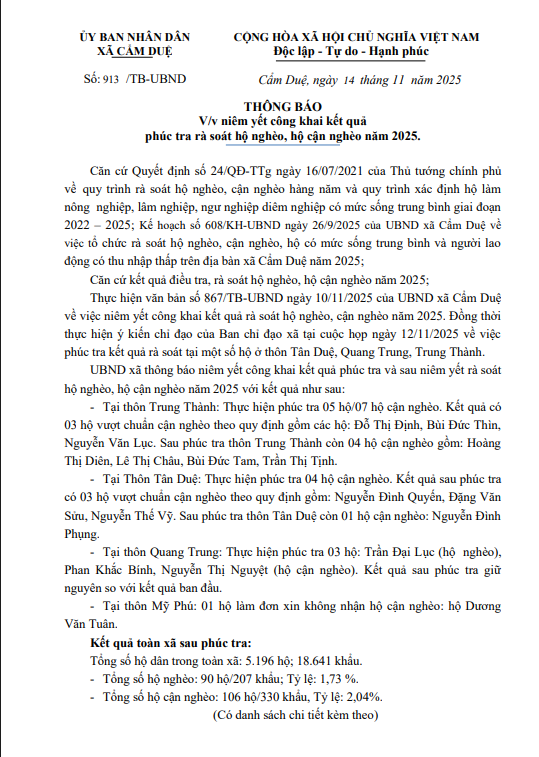 Thông báo niêm yết công khai kết quả phúc tra rà soát hộ nghèo, cận nghèo năm 2025Ẩn danh15/11/2025A -A+Ẩn danh15/11/2025A -A+ File đính kèmLAN-2-NIEM-YET-CONG-KHAI(15.11.2025_08h38p05)_signed.pdf