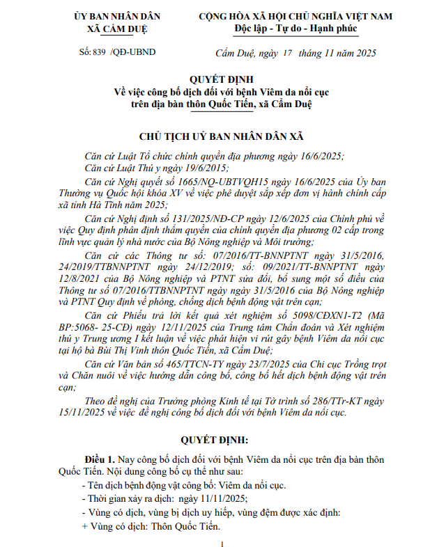Thông báo về việc công bố dịch đối với bệnh Viêm da nổi cục trên địa bàn thôn Quốc Tiến, xã Cẩm DuệẨn danh17/11/2025A -A+Ẩn danh17/11/2025A -A+ File đính kèm856qđ(18.11.2025_10h09p06)_signed.pdf