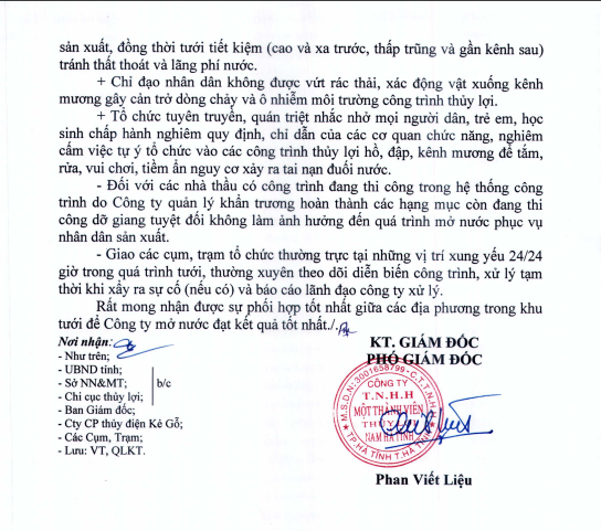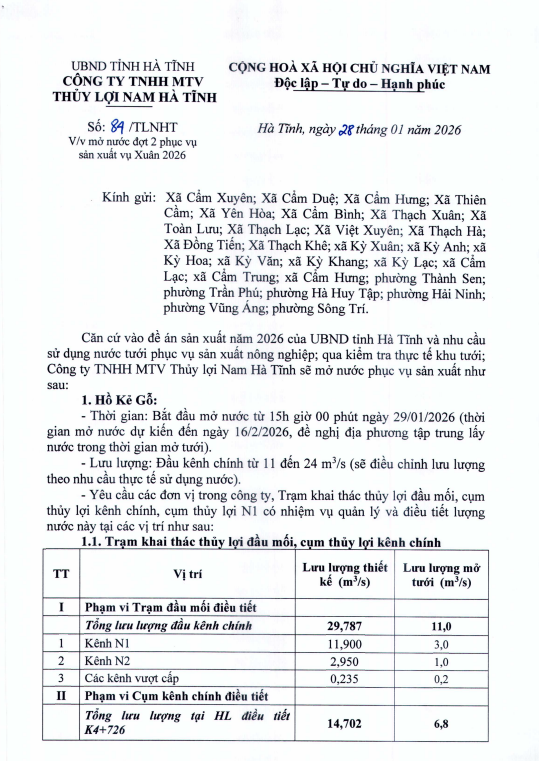 Căn cứ vào đề án sản xuất năm 2026 của UBND tỉnh Hà Tĩnh và nhu cầu sử dụng nướctưới phục vụ sản xuất nông nghiệp, qua kiểm tra thực tế khu tưới Công ty TNHH MTV Thủy lợi Nam Hà Tĩnh sẽ mở nước phục vụ sản xuất với nội dung như sau: