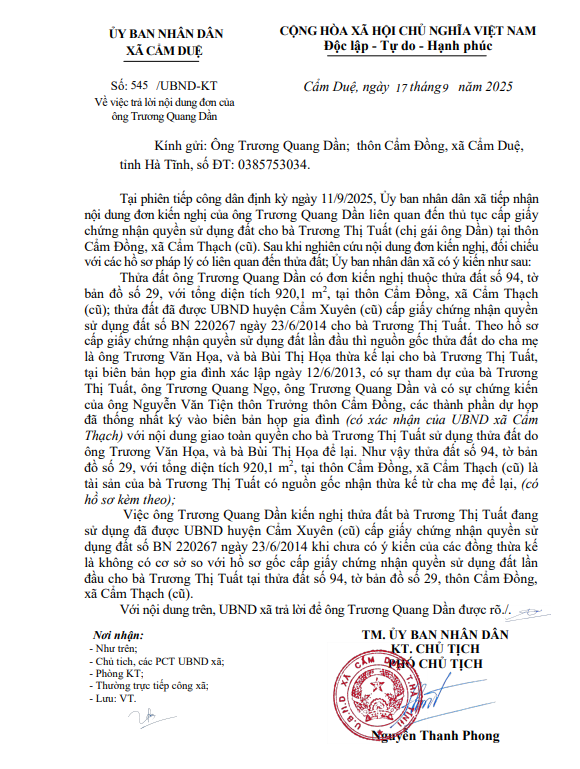 Trả lời nội dung đơn của ông Trương Quang Dần thôn Cẩm Đồng, xã Cẩm DuệẨn danh17/09/2025A -A+Ẩn danh17/09/2025A -A+File đính kèm15.9-tra-loi-ong-Truong-Quang-Dan(17.09.2025_10h12p57)_signed.pdf