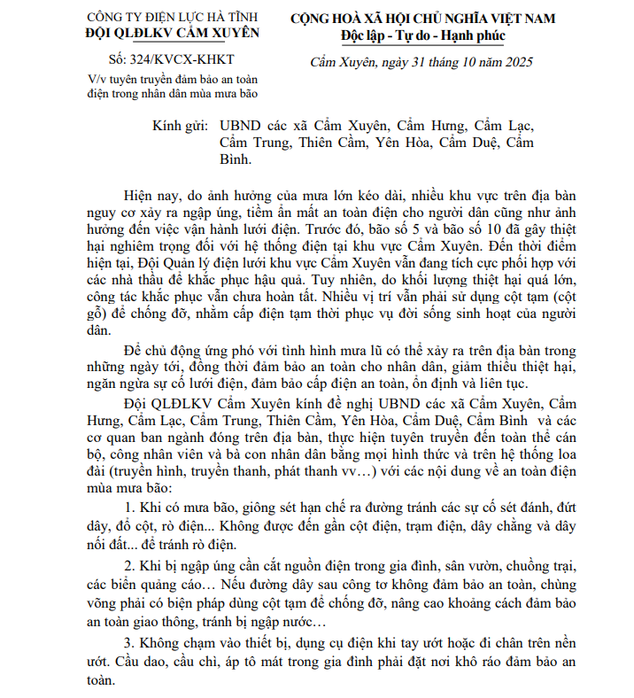 Tuyên truyền đảm bảo an toàn điện trong nhân dân mùa mưa bãoẨn danh31/10/2025A -A+Ẩn danh31/10/2025A -A+ File đính kèmTuyen truyen an toan dien mua mua bao.pdf
